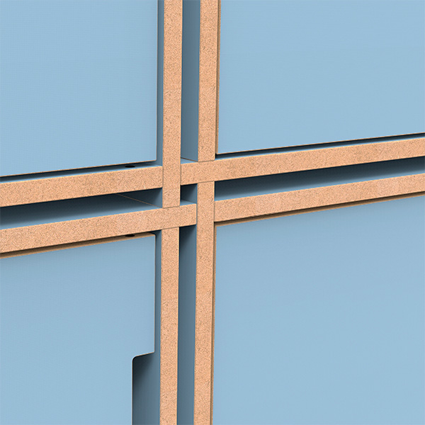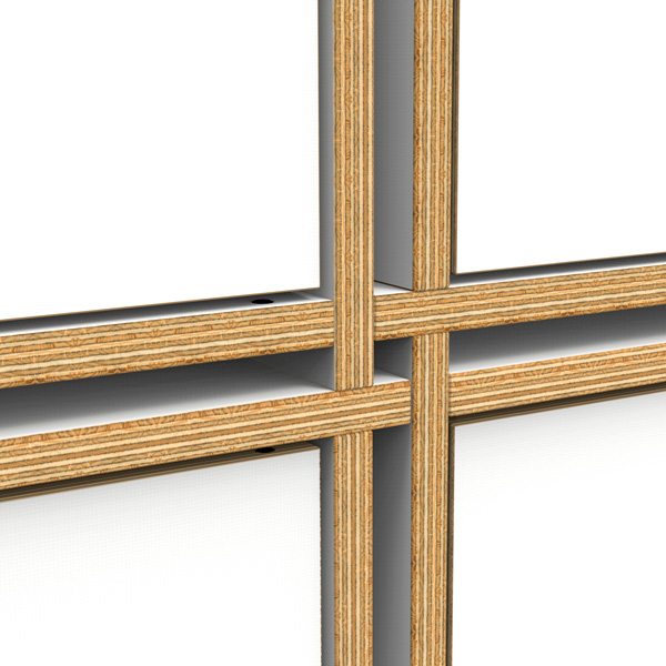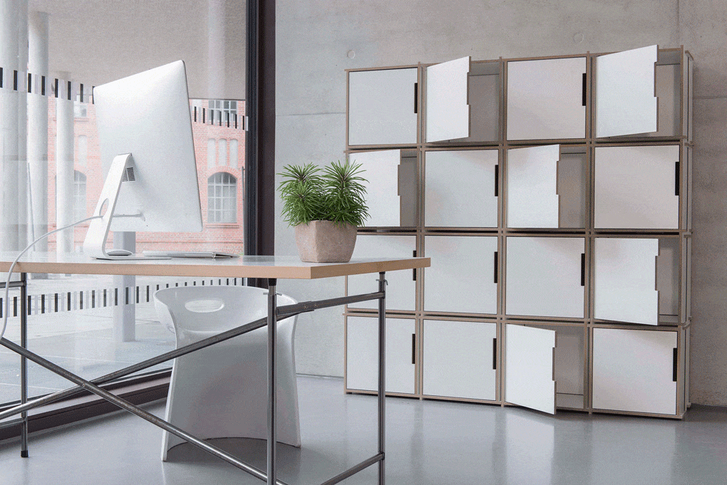 Mit dem Regalsystem 101 lassen sich vielfältige Formate umsetzen: vom Sideboard bis zur Schrankwand, offen oder mit Türen. Die Kuben greifen formschlüssig ineinander, bilden eine stabile Einheit und sind mit wenigen Handgriffen werkzeugfrei auf- und abgebaut. Alle Einzelteile sind gesteckt und werden mit einem außen liegenden Seil verspannt. Die Türen werden durch Magnete schwebend in Position gehalten.
